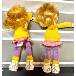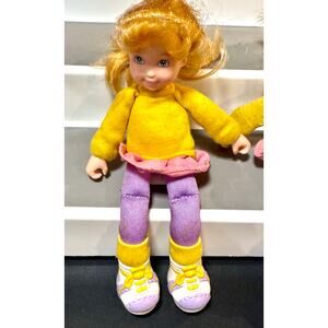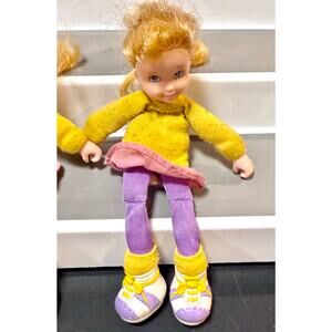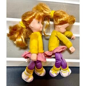 These dolls have cotton yellow shirts, pink skirts, purple silky legs, purple and yellow sneakers. Reddish blonde hair. These are the Amy dolls.