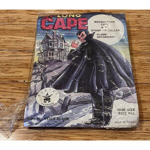 This is a 41 inch RARE vintage Masquerade Cape with a Stand up Collar and it is flame retardant. It is from Rubies, Style no 1533B- Black. It is one size fits all. It is from 1984. This is new in the bag but the bottom of the bag is open. It does not appear to have been removed from the bag at all though. Great for a vampire costume or other cape needing costume.