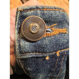 This is a very rare find a pair of gorgeously, embellished and hand beaded jeans with a brand label of She’s. I generally wear a medium and these are too tight in the thigh for me. They do have some stretch, but not enough for me. They are cotton and polyester with no spandex. They are totally gorgeous and if you have thin legs, these are perfect for you. They have a wide bell bottom leg just what is in style now there is a rhinestone at the front button and it is a five pocket design. The change pocket is sewn closed with the beads. There are no care instructions, but I think I would hand wash or dry clean these. These are marked large, but they really do not fit like a large. I have given as many measurements as possible so that you can see if they will fit you properly.