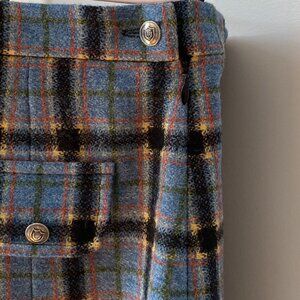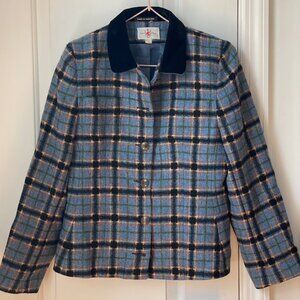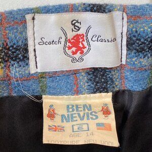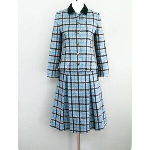 RARE Vintage jacket and skirt suit set. Beautiful deep blue (the mannequin color is lighter than reality due to exposure- please reference the other pictures in natural light) and black plaid with velvet collar and nicely-detailed coat of arms bronze buttons. The jacket has 2 working pockets. All the plaid patterns line up in a show of true vintage craftsmanship. The brand is Scotch Classics and the material is wool. Perfect for a preppy back-to-school look.
