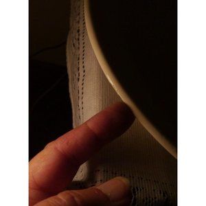 Glazed finish, with crazing visible under bright light consistent with age. Edge is flattened at opposing ends for easier grasping and carrying. Measures 14 inches long, handle to handle and is 11 3/4 inches at widest point. In wonderful condition, ( on bottom side near rim there are small fleabite type chips not visible from the top). Also a manufacturer flaw under glaze. Please note photos 7-10.