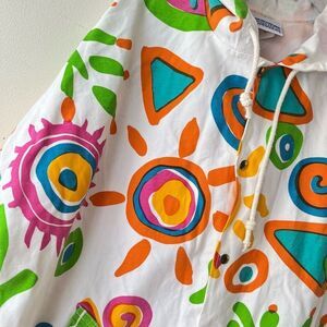 The bright, near-neon, multicolor graphic print features geometric shapes, sunbursts, and abstract swirls in vibrant shades of orange, pink, blue, green, and yellow, perfectly embodying the bold, playful aesthetic of the 80s. The oversized fit, kangaroo-style pockets, drawstring hem, and snap-button front closure make this both functional and a true statement piece.