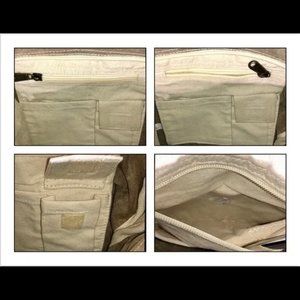 RARE Vintage-Inspired Canvas Domestic Mail Bag. Canvas bag with leather hand straps and an adjustable strap. The front of the bag has 2 pockets with a snap button closure on the flaps, 1 pocket with a snap button closure on the leather strap, and dual leather pen holder loops. The bag has a zipper closure and inside has 1 zipper pocket, a flap with Velcro pocket, and an open pocket.