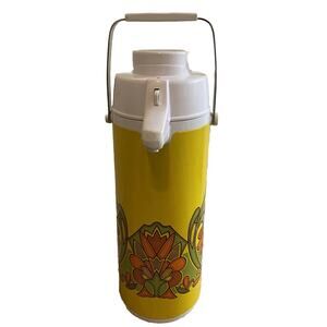 This highly collectible Peacock Air Pot/Carafe features a bold 1970s Retro yellow floral design. This Made in Japan vacuum thermos is perfect for dispensing hot coffee, tea, or cold beverages with its convenient pump-action mechanism. A fantastic piece of Mid-Century Modern (MCM) kitchenware, this iconic item is ready to be the stunning centerpiece of your vintage collection.