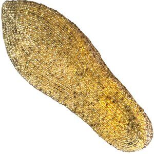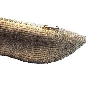 Rare and wonderful find! This vintage silver-gold beaded slipper or pointed toe shoe with a brass pull zipper is lined with whie silk. The interior label reads "Made in Japan." The sole of the slipper appears more gold, whereas the top appears more silver or pewter. It's lovely!