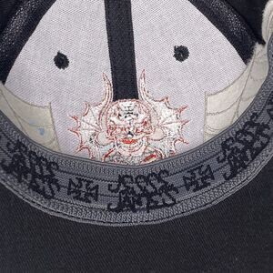 This rare Vintage Jesse James Mac Tools Racing hat features a bold black design with embroidered accents, including a skull, spiderweb, and cross tools. The flexible L/XL size. This hat is in excellent condition.