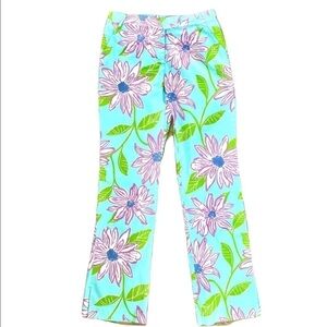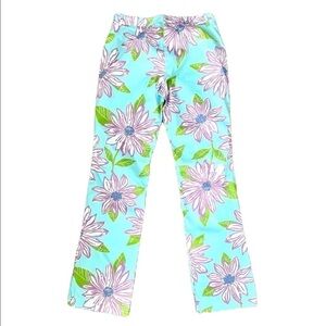 Gorgeous turquoise “To Paulie” pants by a Lilly Pulitzer. Pants have two front slash pockets, belt loops, vent on outside hem, a front zip fly with button, hook and eye tab closure. Turquoise with large purple and white flowers with green stems and leaves. Fade on petal of one flower on back of right leg (see photo) otherwise in EUC. Made of 97% cotton and 3% spandex so they have a little stretch.
