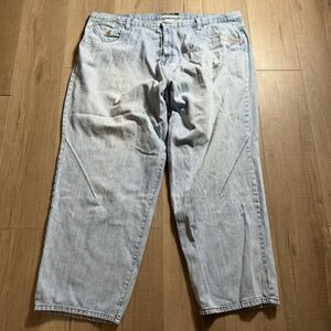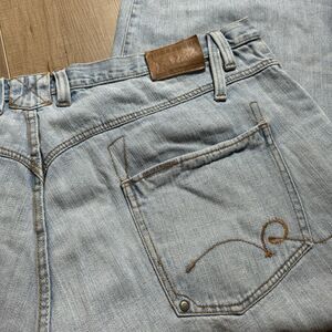 The product is a rare pair of Y2K Rocawear Men's 50x34 baggy 90s designer blue jeans, featuring a hip hop wide leg style. These vintage jeans have a high rise and a 5-pocket design, with button closures and embroidered logo accents. Made from denim cotton fabric, they offer comfort and easy care, suitable for all seasons. The jeans have a relaxed fit and a straight leg silhouette, embodying the urbanwwear, Y2K, and hip hop themes of the 90s. Perfect for those looking for a unique and nostalgic piece to add to their wardrobe.
