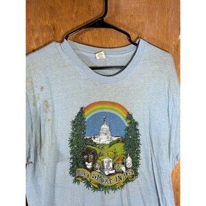 Listed for sale is the shirt shown in the photos. July 4th 1979 Washington DC Smoke-In Protest Hippie Youth International Party YIP. Made in USA. Size men’s XL (closer to a Large in modern sizes). This came from the estate of an older gentleman who passed away. He was drafted to Vietnam and when he returned home became an anti-war protester and traveled the US in a Volkswagen van attending YIP events. Super cool vintage shirt, you probably won’t see another genuine one :). Comes in the condition shown, I haven’t attempted any cleaning on it as I’m not an expert with vintage fabrics and don’t want to cause any damage. Overall just a really neat shirt that should make an amazing addition for someone :). Thank You
