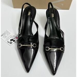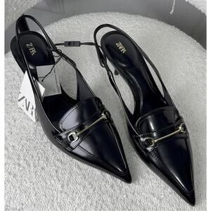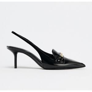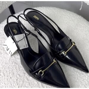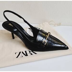 RARE!!! Black slingback pumps. Metallic buckle with raised detail on the front. Topstitching detail. Back strap with elastic section. Thin mid-height heel. Pointed toe. From ZARA, in US size 7.5 (EUR 38), 8 (EUR 39), 9 (EUR 40) and 10 (EUR 41). New with tags. Sold out in stores.