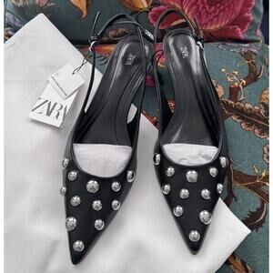 RARE!!! Black slingback heels with studs around the edge. Kitten heels. Buckled ankle strap closure. Pointed toe. From ZARA, in US size 8 (EUR 39). New with tags. Sold out in stores.
