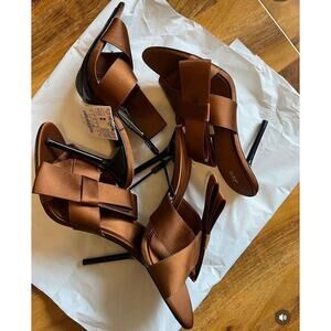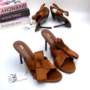 RARE!!! Brown heeled sandal in a satin effect. Front crossover straps with side bow detail. Thin heel. Rounded point toe. From ZARA, in US size 7.5 (EUR 38) and 8 (EUR 39). New with tags. Sold out in stores.