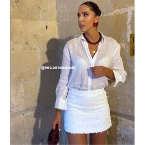 RARE!!! White mini skirt with a high waist made with beaded and sequined fabric with a delicate flower-like embroidery. A-line silhouette with a slightly belled hem, this is the perfect piece to elevate any look. Interior lining made of viscose. Hidden in-seam zip closure. From ZARA, in size L. New with tags. Sold out in stores.