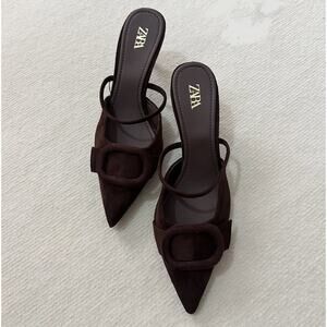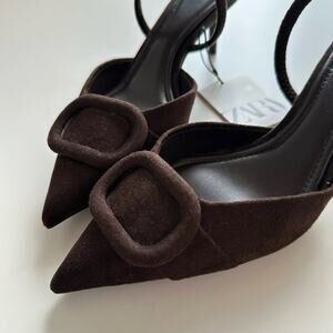 Dark brown slingback shoes in a soft-effect fabric. Lined appliqué detail at the front. Adjustable back strap. High stiletto heel. Pointed toe. From ZARA, in US size 6.5 (EUR 37). New with tags. Sold out in stores.