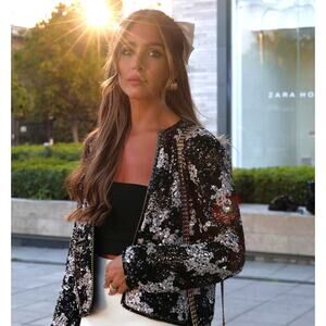 RARE!!! Round neck long sleeve cardigan. Front pockets. Sequin appliqués. From ZARA, in size S. New with tags. Sold out in stores.