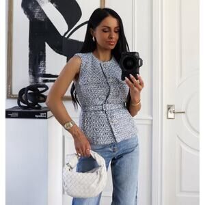 RARE!!! White/sky blue sleeveless round neck vest. Matching belt and front flap pockets. Front welt pockets. Gold-tone button front closure. From ZARA, in size XL. New with tags. Sold out in stores.