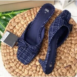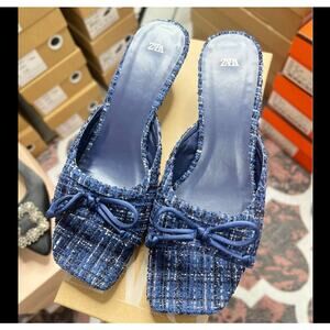 Blue fabric kitten heel mules. Wide strap with bow. Squared toe. From ZARA, in US size 9 (EUR 40). New with tags. Sold out in stores.