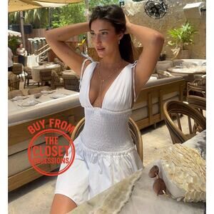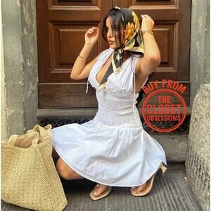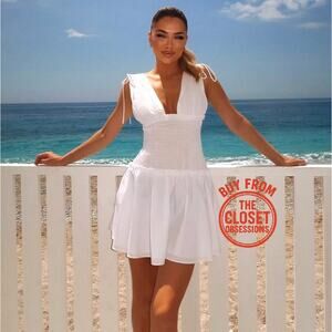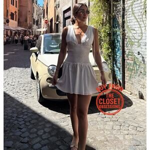 RARE!!! White short V-neck dress. Wide adjustable shoulder straps with ties. Elastic honeycomb fabric at waist. Matching inner lining. From ZARA, in size L. New with tags. Sold out in stores.