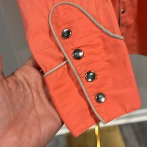 This is a vintage, 1970's, ladies cowboy rodeo style long sleeve button front coral color shirt with gray piping and multi button wrists by Ralph Lauren from his early Western Wear division.