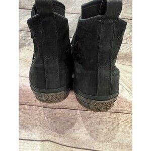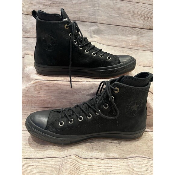 This is a pair of Converse Chuck Taylor All Star waterproof nubuck sneaker in black, size 9.5. These lace-up boots feature a solid pattern, leather upper material, rubber outsole, and medium shoe width. They are designed for casual occasions and are suitable for all seasons. The model number for this style is 157460C, and it is part of the Converse Chuck Taylor All Star product line. Smoke free home.
