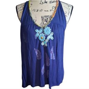 RARE! Free People Vintage Blue Halter Top with Floral Accents Size Small