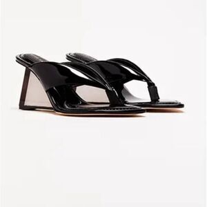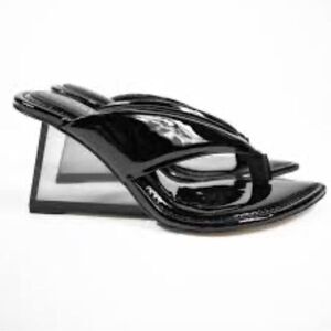 RARE Sold Out New Cinderf*cking Rella black patent Wedge sandal lucite heel Sz 9 size up 1/2 size per Good American website.