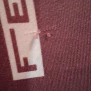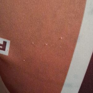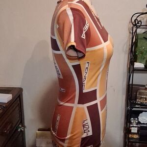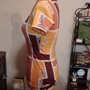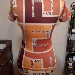 Stylish Fendi tee with bold brown and yellow graphic pattern. Short sleeves for a chic look.