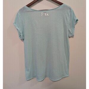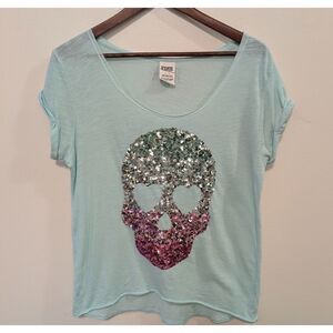 Rare PINK graphic tee! Collectible shirt. Short-sleeve scoop neck, rolled sleeves. Light blue/aqua semi-sheer fabric. Sequin skull graphic: silver/aqua to pink/magenta ombre. Oversized, off-shoulder, size large. Great condition. Sequins intact.