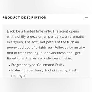 The scent opens with a chilly breeze of juniper berry, an aromatic evergreen. The soft, wet petals of the Fuchsia Peony add pop of brightness. Followed by an airy hint of fresh meringue for sweetness and light.
