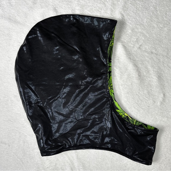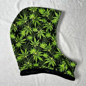 Reversible rave hood. One side has shimmery black fabric and the other side has weed leaf print. One size fits all.