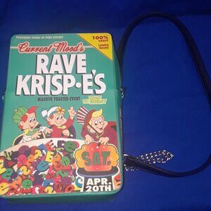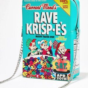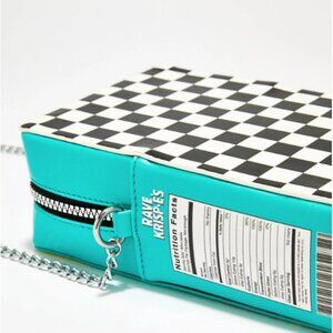 Mood Rave Krisp-E's Crossbody Bag is part of a balanced beat per minute! Wake N' rave with this euphoric crossbody bag that has a chain shoulder strap, a top zipper closure, nutritional factz on the side, and a checkered pattern on the back.