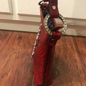 Brand new, never used red alligator print purse with a cross made from metal accents and rhinestones. The purse is on the smaller side and has a purple zebra print on the inside. As well as this, on the inside is two pockets - one with a zipper and one without a zipper. Feel free to make an offer!