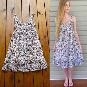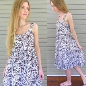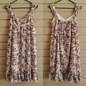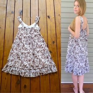 brown and white zebra animal print midi dress! Thick, wide straps. V-neckline. Lined. Empire waist so baby doll style.
