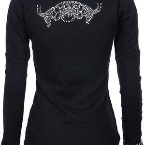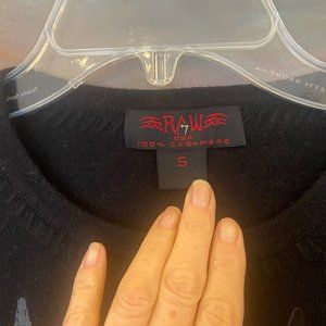 RAW 7 100% Cashmere Batgirl Crew Neck Black Sweater Size S. Smoke Free Home/New with Tags. Sleeve with jewels has small hole as seen in photo.
