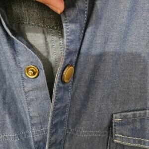 Stylish blue snap shirt featuring gold buttons. Perfect for casual or formal wear.