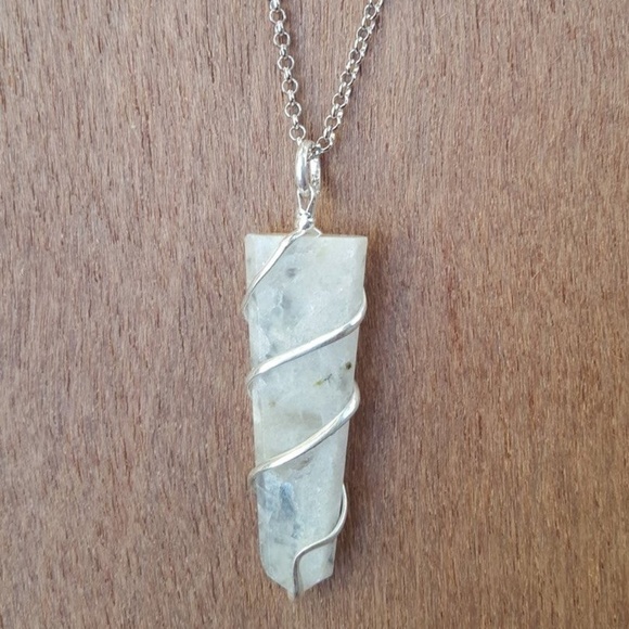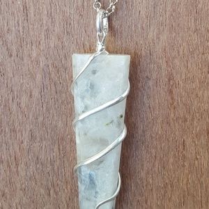 This super fun unique piece is made of a raw Moonstone flat point wrapped with a silver plated wire, hanging from a 22" Rhodium chain, and connects with a lobster claw. A true statement piece!