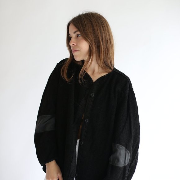 Vintage Overdye Black Coat. Loop Terry Cloth-esque on the one side and silky fabric on the reverse. Buttons on terry side only. One interior right Pocket. Closure is a bit assymetrical. Please note that the loop terry side is a bit rough and best work with long sleeves.