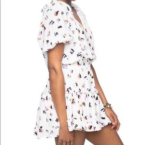 The Ray Dress features a short elastic puff sleeve, elastic waist, V-neck, tassels to be tied and ruffled detailing!