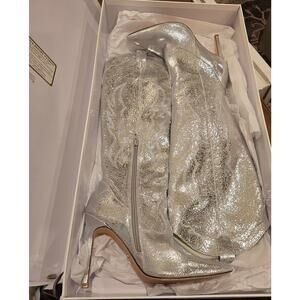 Keywords: RAYE Bronco boot, silver cowboy boot, metallic western boot, women’s size 7, high heel cowboy boot, statement boot, festival boot