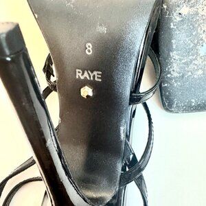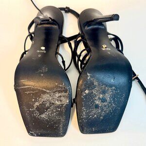 Details: Patent leather upper with leather sole. Made in China. Ankle strap with buckle closure. Strappy vamp. Leather lining. Square toe. Approx 5 5-inch heel.