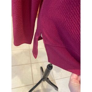 The RBX Active women's pullover sweater in size XL offers a comfortable fit with its medium weight and unique textured knit fabric. Made from a blend of polyester, rayon, and spandex, it features a cowl neck and long sleeves, making it ideal for casual fall occasions. The maroon color and side slit add a touch of style. This sweater is machine washable for easy care. It is pre-owned with light wear.