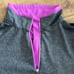 Tags: quarter zip pullover, women’s athletic top, performance wear, workout shirt, striped activewear, black, gray and purple top, long sleeve running shirt, moisture wicking, fitness apparel, training top, gym wear, stretch fabric, breathable top, casual sportswear, active lifestyle, contrast zipper, lavender collar detail, comfy athletic pullover.
