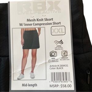 RBX Mesh Knit Black Skort with Compression Shorts. Features Slab Front Pocket with Zipper, as well as, a Pocket on the Inside Shorts and an Elastic Waistband.