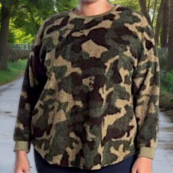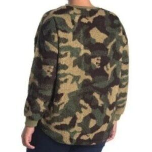 Soft to the touch, a boucle sweater features an allover camo print and classic crew neck.