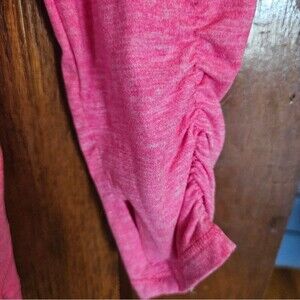 Pink, long-sleeved RBX pullover top. It has a mock neck with a short zipper and a small button detail at the neckline. The sleeves have gathered cuffs, and the hem is slightly curved. It appears to be made of a lightweight, stretchy material. RBX is a brand that specializes in activewear. The top is likely designed for workouts or casual wear. Ruched arms and finger holes.
