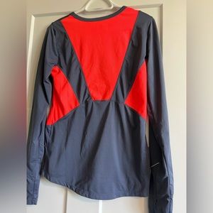 This top has a vibrant orangish pink color to contrast with the great. It is a wicking material. Has breathable mesh in the back and thumb holes on the arms.