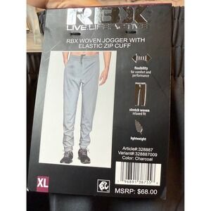 RBX woven jogger pants, designed for comfort and performance. These pants feature a stretch woven fabric that offers a relaxed fit, ensuring flexibility during any activity. The lightweight design enhances breathability, while the elastic waistband provides a secure and comfortable fit. Zippered cuffs add a touch of style and functionality, allowing for adjustable ventilation and easy on-and-off. These joggers are a versatile addition to any wardrobe.