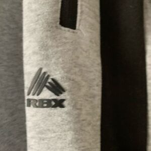 RBX grey with black inserts sweatpants, brand new, tags attached, excellent condition, drawstring around the waist, black, vertical front zippers, soft fleece lining, size Medium.