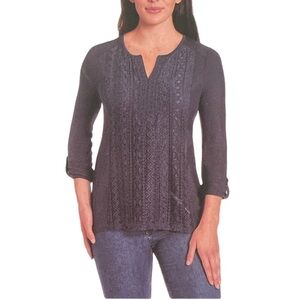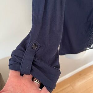 RBX indigo blue lace overlay 3/4 Length sleeve top. Gorgeous blue indigo color. Notched V-neck. Three-quarter length sleeve with strap and button to roll sleeves. Comfortable stretchy material. New with tags! Women’s size small. Rayon, spandex, cotton, nylon material. Women’s size small. Measures approximately 19 inches flat across chest from armpit to armpit, 24 inches in length.