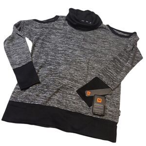 RBX Cold shoulder Top, with loose turtle neck, long sleeves that go over hand and have hole for your thumb. Beautiful grey and black.